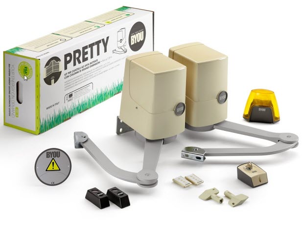Le Kit est composé de : 2 Motoréducteurs 24 v dc, 1 centrale de commande 24 v dc avec récepteur incorporé, 1 paire de photocellules, 1 feu de signalisation avec antenne intégrée 433 Mhz, 2 émetteurs 3 canaux 433 Mhz,1 panneau d'avertissement. 1 DVD de montage simplifié.